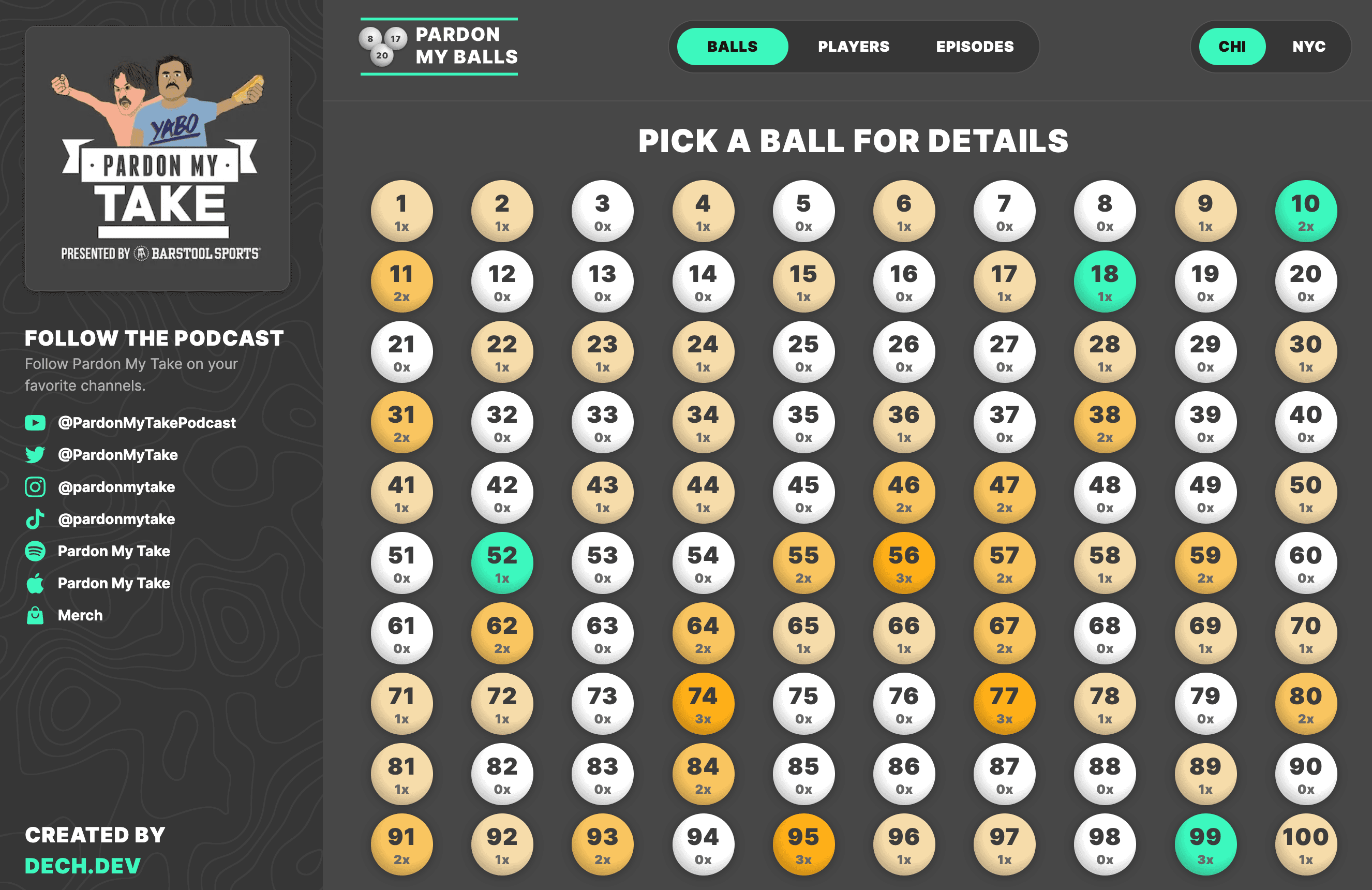 Created, designed, and developed, a user-friendly interface to track lottery ball numbers drawn in popular sports podcast, Pardon My Take.